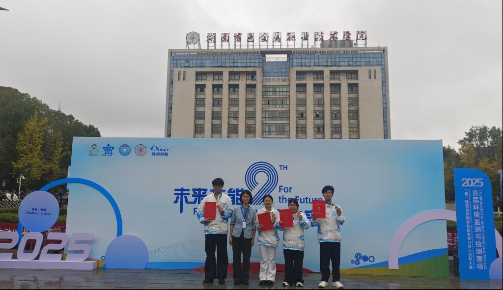 2025 年 10 月 17 日至 19 日,一带一路暨金砖国家技能发展与技术创新大赛首届“环境监测与检测赛项” 在湖南有色金属职业技术学院成功举办。我院食品园林学院环境工程技术专业学生丁思杞、张欣怡与袁帅、朱涵坤分别组成两支参赛队伍,与来自全国的210支高职组队伍同台竞技,最终凭借扎实的专业知识储备与稳定的临场发挥,两支队伍均荣获赛项铜奖,指导教师齐丽彬、高晓松也在赛事过程中积累经验、受益匪浅。