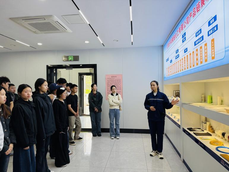 实践首站来到三门峡奥科化工有限公司。在企业技术总监的带领下,师生们通过安全教育培训后,分组参观了工程技术研发中心、分析检测实验室等。在中控室,同学们亲眼见证DCS控制系统对生产流程的精准调控,详细了解巯基乙酸异辛酯等核心产品的合成工艺,对精细化工“小批量、高纯度、高附加值”的产业特点形成直观认知。